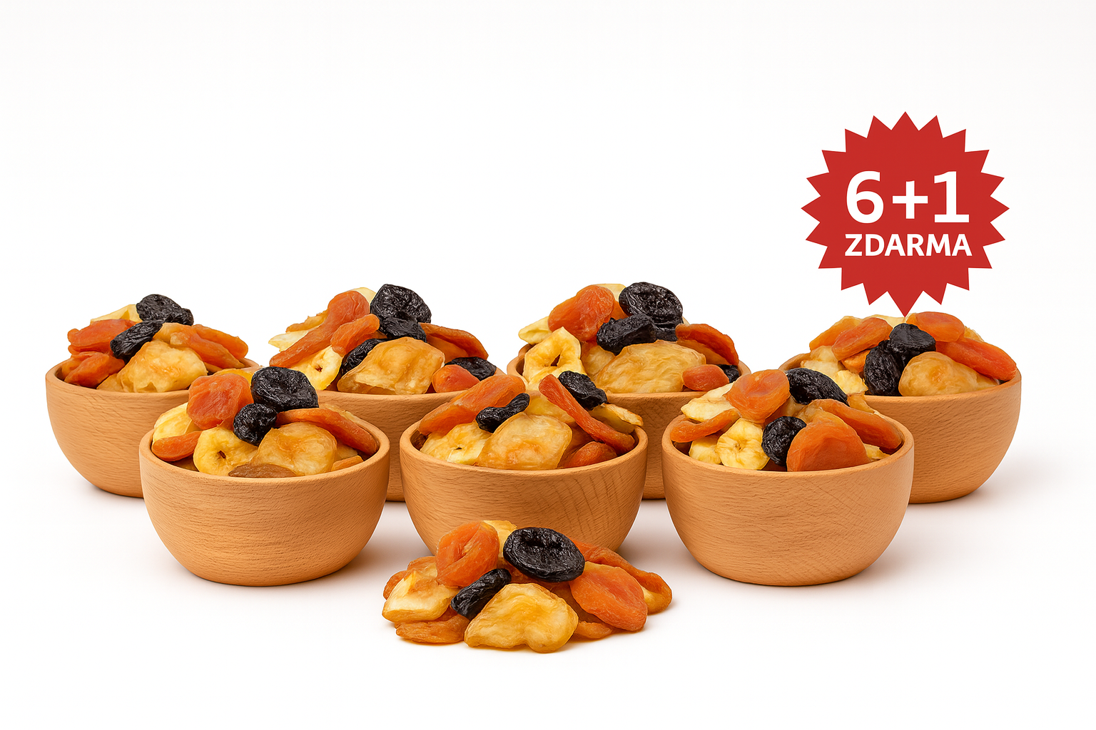 Sušené meruňky, švestky, hrušky bez cukru a jablka – vše v přirozené sladkosti a bez zbytečných příměsí. Nyní v akci 6×200 g + 1 zdarma pro zdravé mlsání každý den.