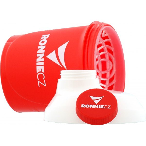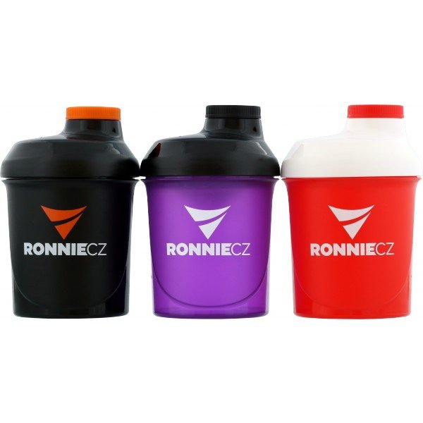 Šejkr Ronnie.cz má červenou barvu nádoby, bílý uzávěr a červené malé šroubovací víčko. Nádoba je matná, transparentní se dvěma hladkými průhledy pro kontrolu náplně. Uzávěr je hladký s matným malým víčkem. Na šejkru je po stranách decentní logo Ronnie.cz v bílém provedení, na malém víčku také. Po stranách jsou rysky v ml/oz pro odměření. Objem šejkru je 300 ml. Šejkr obsahuje mřížku pro lepší rozmíchání nápoje. Šejkr, který pro jeho design ocení opravdu kdokoli!