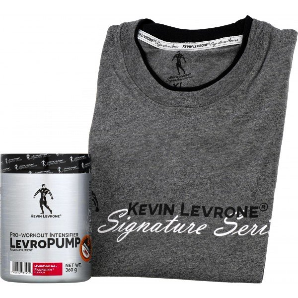 Pohodlné bavlněné triko ze série Kevin Levrone Signature s potiskem na prsou a šíji, krátký rukáv, kulatý výstřih - zdvojený (černý vnitřní límeček). Šedá barva s černým potiskem. Šev za krkem překryt a zpevněn pruhem s logy. Materiál: 100 % bavlna.