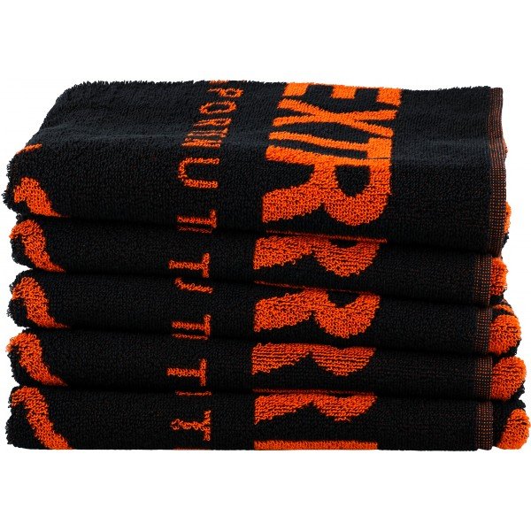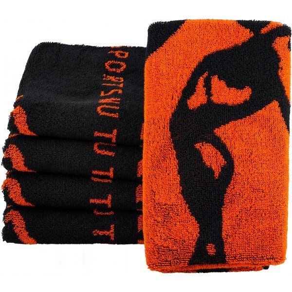 Funkční stylový froté ručník s oboustranným potiskem - jedna strana černá s logem v oranžovém provedení, druhá oranžová se zrcadlově umístěným černým logem.