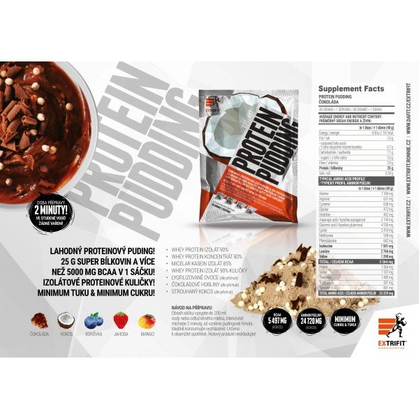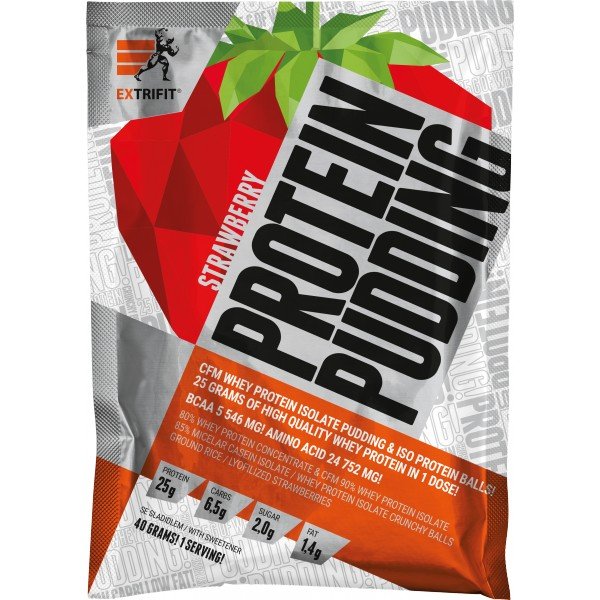 25 gramů nejkvalitnějšího syrovátkového izolátu v prémiovém proteinovém pudinku. Protein Pudding od firmy Extrifit je skvělý vysokoproteinový krém, mimořádně lahodné chuti. Žádné vaření, vše za studena - příprava pouze 2 minuty! Protein Pudding je vhodný jako skvělá svačina a je také vynikající alternativou k běžným proteinovým koktejlům - pudink lépe zasytí a navíc si výborně pochutnáte! Je vhodný nejen pro všechny, kdo usilují o nárůst síly a svalové hmoty, ale i při rýsování a redukční dietě!