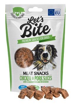 Kuřecí a vepřové plátky s brusinkami a artyčoky. Delikátní masové pochoutky pro všechny psy masíčkáře a jejich výcvik. Ideální pro výcvik, odměňování nebo mlsání. Masové pamlsky jsou šémem k poslušnosti a podporují přirozený žvýkací instinkt psa. Doplňkové krmivo pro psy.