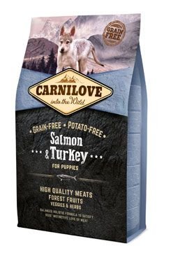 Krmivo Carnilove Salmon & Turkey je holistické vysoce kvalitní krmivo z lososa a krocana bez obilovin a bez brambor vhodné pro štěňata všech plemen od 4. týdne do 12. měsíce věku psa. Granule jsou vhodné i pro březí a kojící fenky.