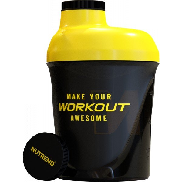 Šejkr Nutrend má černou barvu nádoby, žlutý uzávěr a černé malé šroubovací víčko. Nádoba je matná, transparentní se dvěma hladkými průhledy pro kontrolu náplně, jeden má rysky v ml. Uzávěr je hladký s matným malým víčkem s potiskem Nutrend. Na šejkru je po stranách nápis N1 Pre-Workout a Make your workout awesome v žlutém provedení. Objem šejkru je 300 ml. Šejkr obsahuje mřížku pro lepší rozmíchání nápoje. Šejkr, který pro jeho design ocení opravdu kdokoli! [zbozi:7794,7793]