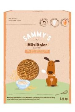 Sušenky jsou speciálně navrženy pro velké psy s hmotností nad 30 kg. Základem pamlsků je vysoce kvalitní směs obilovin s ovesnými vločkami, kukuřicí, celozrnným ječmenem, pšeničnou a špaldovou moukou a pšeničnými vločkami. Obsahují také drůbeží bílkoviny, které recepturu chutně doplňují. Sammy's Müsli taler vypadají lákavě díky své zlatohnědé křupavé kůrce a jsou ideální jako svačinka mezi krmeními.