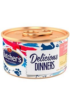 Konzerva 85g Classic Delicious Dinners s lososem a krevetami je vynikající potravou, která poskytuje vaší kočce potřebné vitamíny a minerály. Recept byl obohacen Taurinem pro zdravé srdce. Připravené z čerstvého masa, bez umělých konzervačních látek, cukrů a barviv.