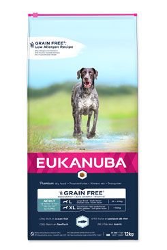 Nová receptura Eukanuba Grain Free* (bez obilovin) je určena speciálně pro dospělé psy velkých a obřích plemen. Obsahuje nízkým podíl alergenů. Složení granulí pro psy je pečlivě sestaveno tak, aby neobsahovalo běžné alergeny, které nejsou vhodné pro trávení zvířete nebo poškozují kvalitu jeho srsti a pokožky. Šetrné složení představuje alternativu pro psy se zvláštními nutričními požadavky. Do složení jsou přidány nezbytné vitamíny a minerály na podporu zdravého růstu a vývoje štěněte (např. vápník a glukosamin). Superprémiové krmivo je vhodné pro psy bez zdravotních problémů, pro psy s citlivou kůží, pro psy s citlivým zažíváním nebo pro psy s problematickou srstí bez lesku. Granule jsou speciálně vytvarovány. Jejich tvar podporuje zdraví zubů.