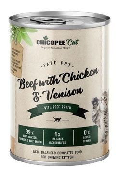 Maso a deriváty živočišného původu 68 % (z toho 40 % hovězího směs masa, plíce, játra, 21 % kuře směs masa, srdce, krky, 7 % zvěřina směs masa, droby), hovězí vývar (31 %), minerály (1 %)