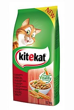 KITEKAT granule s hovězím masem a zeleninou. Suché krmivo vyrobeno z chutného masa, vlákniny a zeleniny, nyní s více bílkovinami.