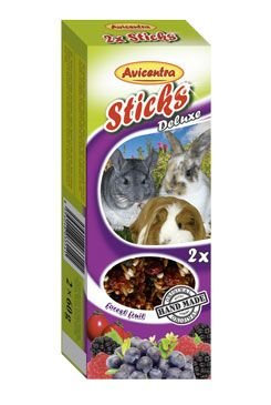 Doplňkové krmivo pro králíky, morčata a další hlodavce. Tyčinky s lesním ovocem jsou výbornou pochoutkou, ale také krmivem, které Vašemu mazlíčkovi dodává důležité vitamíny a minerály pro zdravý a vitální život. Tyčinky jsou speciální krmivo, kde musí Váš mazlíček vyvinout úsilí k získání své potravy podobně jako v přirozeném prostředí. To napomáhá jeho fyzické a psychické kondici.