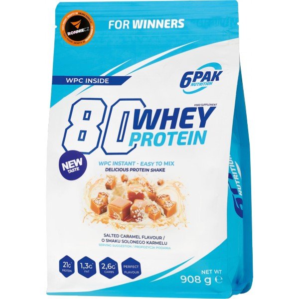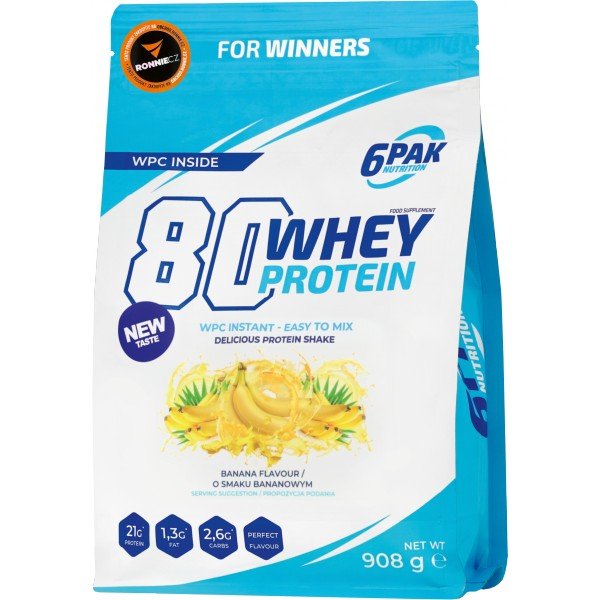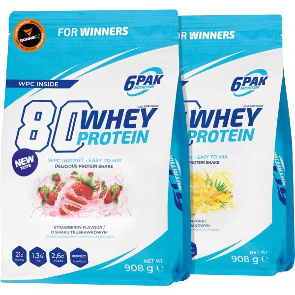 80 Whey Protein od 6Pak Nutrition je pečlivě vyvinutý proteinový doplněk, ze kterého si můžete připravit lahodné koktejly, nebo ho použít jako doplněk k vlastním fit pokrmům. Výběr až z 25 příchutí znamená, že není šance, že Vás tento produkt někdy omrzí. Proteinový doplněk 80 Whey Protein je vynikající pro všechny fyzicky aktivní lidi bez ohledu na úroveň jejich tréninku. Nemusíte být sportovec, abyste mohli užívat proteiny. 80 Whey Protein může používat každý, komu záleží na vzhledu těla, kondici a skvělé pohodě.
