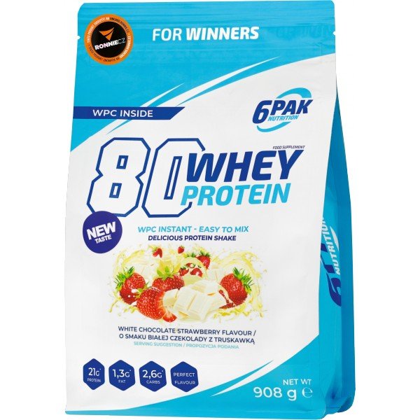 80 Whey Protein od 6Pak Nutrition je pečlivě vyvinutý proteinový doplněk, ze kterého si můžete připravit lahodné koktejly, nebo ho použít jako doplněk k vlastním fit pokrmům. Výběr až z 25 příchutí znamená, že není šance, že Vás tento produkt někdy omrzí. Proteinový doplněk 80 Whey Protein je vynikající pro všechny fyzicky aktivní lidi bez ohledu na úroveň jejich tréninku. Nemusíte být sportovec, abyste mohli užívat proteiny. 80 Whey Protein může používat každý, komu záleží na vzhledu těla, kondici a skvělé pohodě.