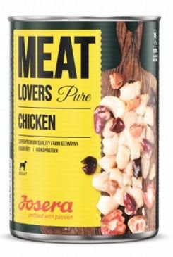 Opravdoví milovníci masa vědí, co chtějí: Spooooustu chutného masa! A přesně to dostanou do misky s krmivem Pure Chicken od Josery. Jejich špičkové prémiové mokré krmivo pro dospělé psy obsahuje chutné kuřecí maso a je bez obilovin, lepku i zbytečných přísad v podobě cukru, barviv, aromat a konzervačních látek. Nevěříte tomu? Tak se prosím podívejte na složení, které uvádějí na plechovce. Nijak se netají tím, z čeho je připravené jejich prémiové mokré krmivo.