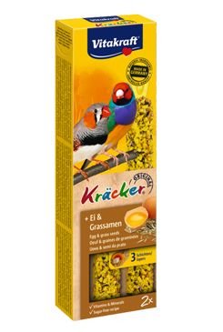 Vitakraft Kräcker Exot Egg jsou vaječné tyčinky pro exoty. Speciální tyčinka na ozobávání s vejci. Doplňkové krmivo pro exoty. V ptačím obydlí by neměla tyčinka nikdy chybět. Třikrát pečená s dřívkem uvnitř.