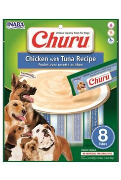 Churu masové pyré pro psy s kuřecím z farmářského chovu a divokým mořským tuňákem. Šťavnaté, měkké a extra lahodné masové mini kapsičky bez obilovin. Zdravé mlsání s nízkým obsahem kalorií, bez konzervantů a bez umělých dochucovadel. Inovativní měkká konzistence pamlsku Churu vám umožní trávit společné chvíle s vaším pejskem hravým a interaktivním způsobem. Díky možnosti podávat extra chutnou grain free masovou pochoutku na způsob psí kapsičky přímo "z ruky" objevíte nový způsob odměňování. Churu bude bavit vás i vašeho psa! Masové pyré můžete také podávat stejně jako jinou psí kapsičku přímo z misky nebo ho můžete přidat ke granulím pro vylepšení jejich chuti. Psí pamlsky Churu mají vysoký obsah vody a díky tomu jsou vhodným doplňkem k suchému krmivu nebo pro psy, kteří málo pijí.